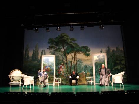 Tante' im Chemnitzer Schauspielhaus CHEMNITZ - Der Bühnenhintergrund ist wunderwunderwunderschön. Was für ein bunter Garten Eden, voll von prächtigen Rosen, üppigem Grün, stolzem Pfau, darüber azurblauglasklarer Himmel, da und dort ein hingetüpfeltes Weißwölkchen. Was noch ist sehenswert