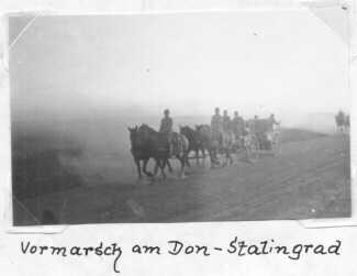 Auf dem Pferd sitzt der deutsche Soldat. Er hat das linke Bein erfroren