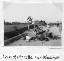 toter Pferde und auf einem Panje-Wagen werden 3 getötete Zivilisten